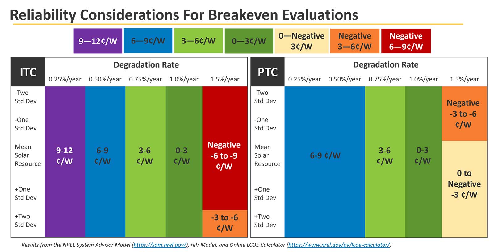 Techno-economic analysis for module technologies based on tax credits, solar resource, and degradation.